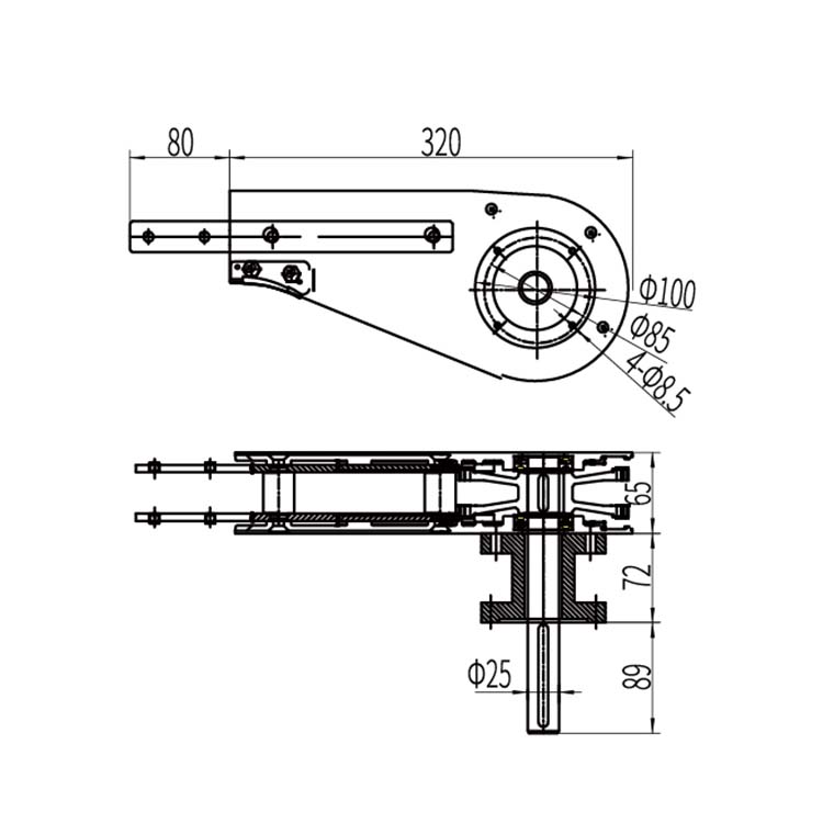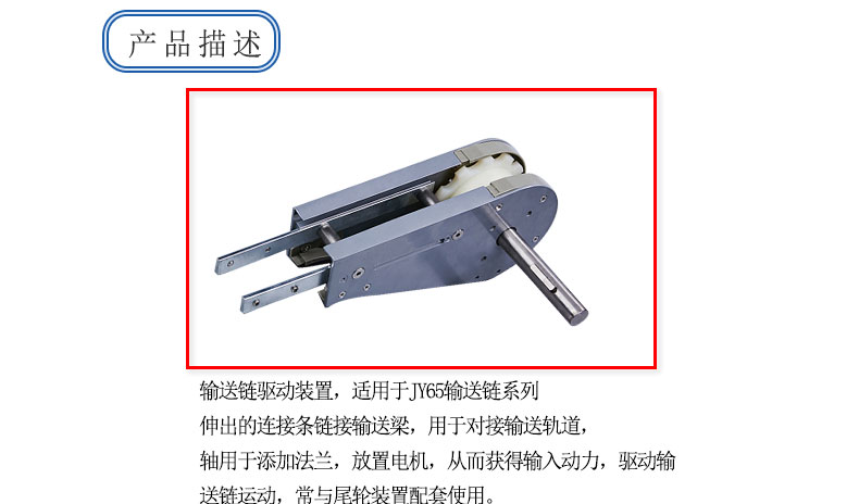 输送链驱动装置,用于输送链的驱动。 伸出的连接条链接输送梁,用于对接输送轨道, 轴用于添加法兰,放置电机,从而获得输入动力,驱动输送链运动,常与尾轮装置配套使用。