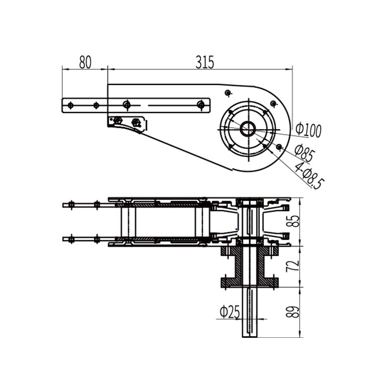 输送链驱动装置,用于输送链的驱动。 伸出的连接条链接输送梁,用于对接输送轨道, 轴用于添加法兰,放置电机,从而获得输入动力,驱动输送链运动,常与尾轮装置配套使用。