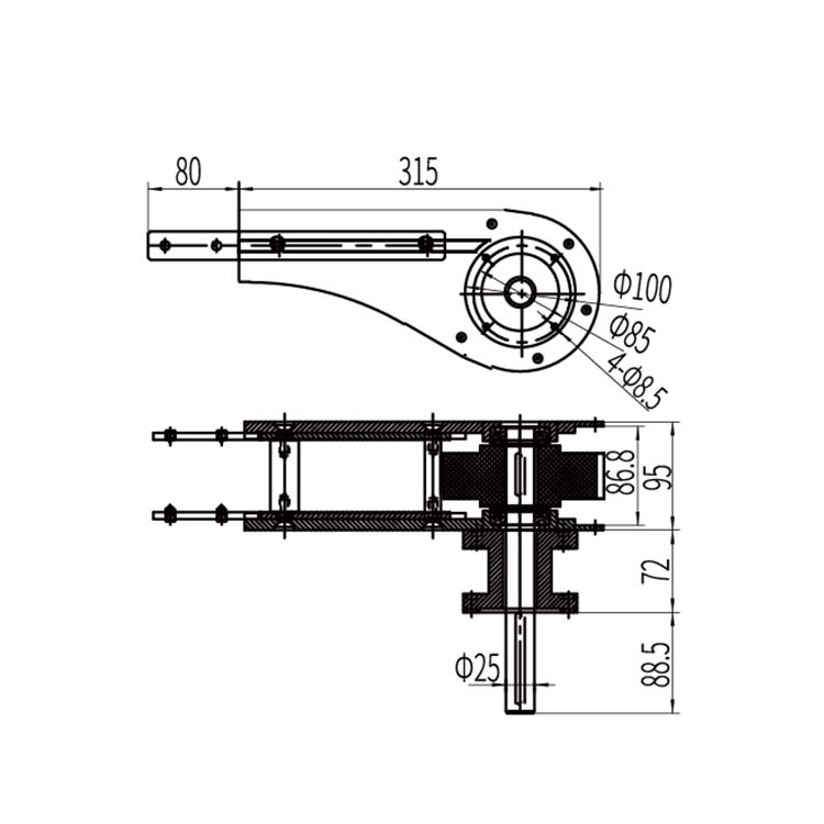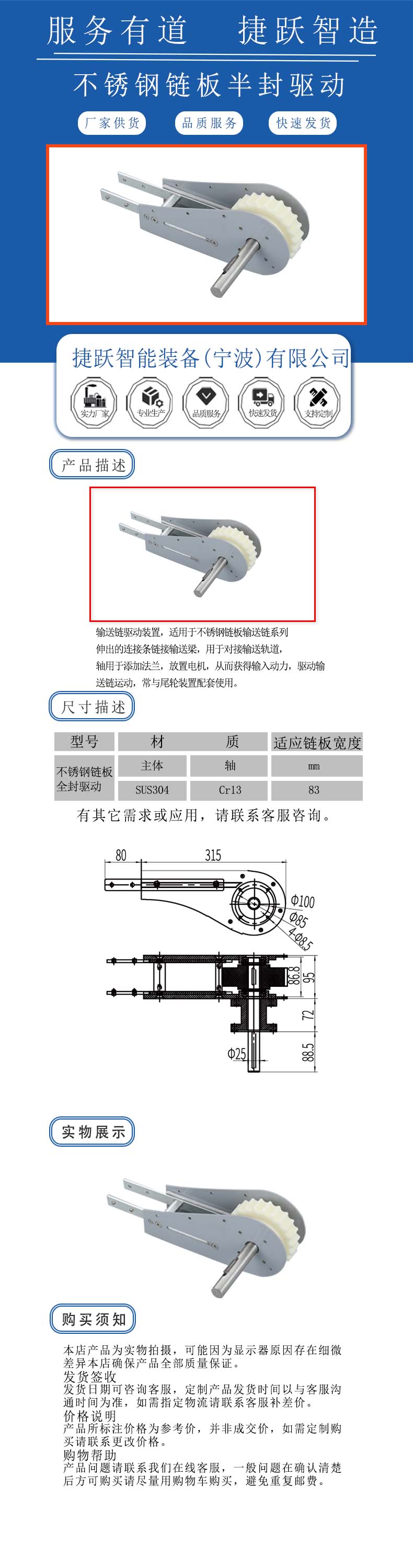 输送链驱动装置,用于输送链的驱动。 伸出的连接条链接输送梁,用于对接输送轨道, 轴用于添加法兰,放置电机,从而获得输入动力,驱动输送链运动,常与尾轮装置配套使用。