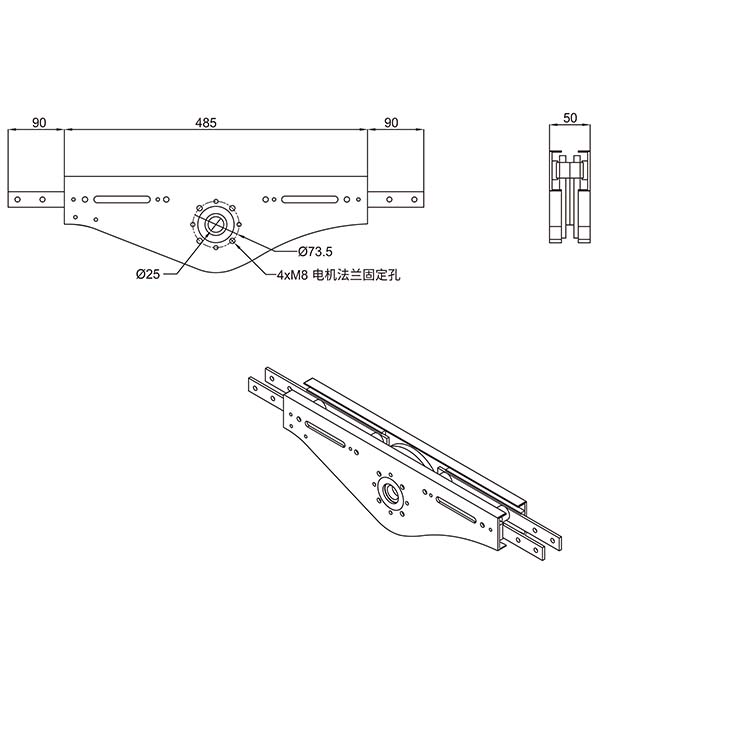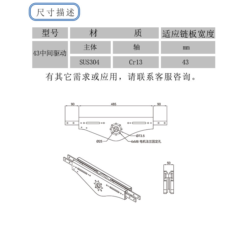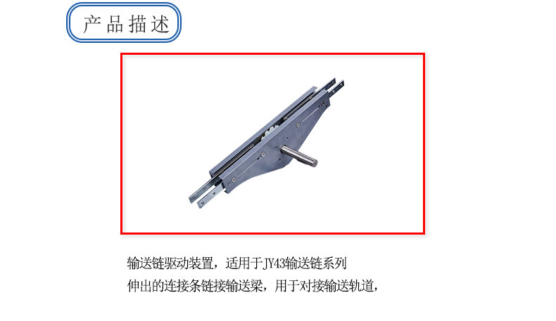 输送链驱动装置,用于输送链。 伸出的连接条链接输送梁,用于对接输送轨道, 轴用于添加法兰,放置电机,从而获得输入动力,驱动输送链运动,常与尾轮装置配套使用。