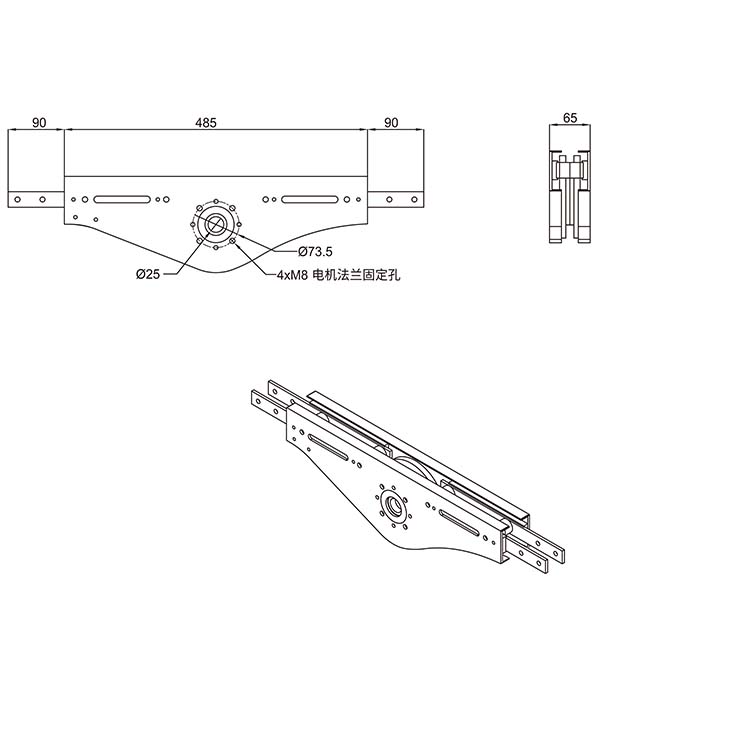 输送链驱动装置,用于输送链。 伸出的连接条链接输送梁,用于对接输送轨道, 轴用于添加法兰,放置电机,从而获得输入动力,驱动输送链运动,常与尾轮装置配套使用。