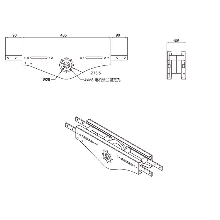 输送链驱动装置,用于输送链。 伸出的连接条链接输送梁,用于对接输送轨道, 轴用于添加法兰,放置电机,从而获得输入动力,驱动输送链运动,常与尾轮装置配套使用。