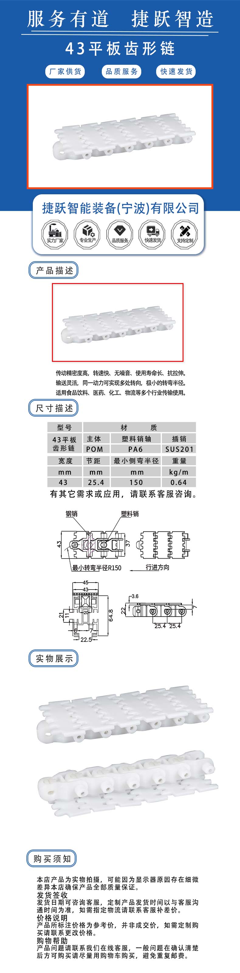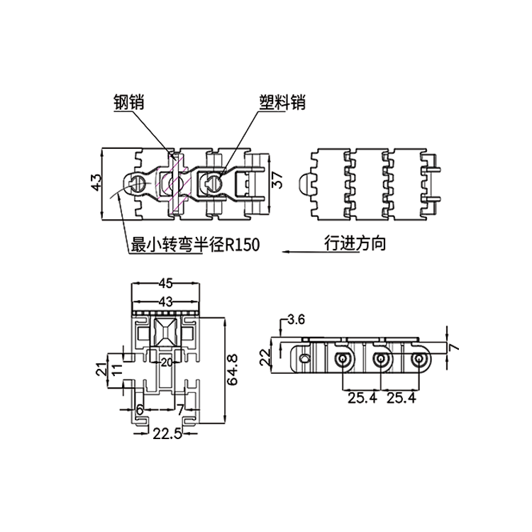 传动精密度高,转速快、无噪音、使用寿命长、抗拉伸。 输送灵活,同一动力可实现多处转向,极小的转弯半径。 适用食品饮料、医药、化工、物流等多个行业传输使用。