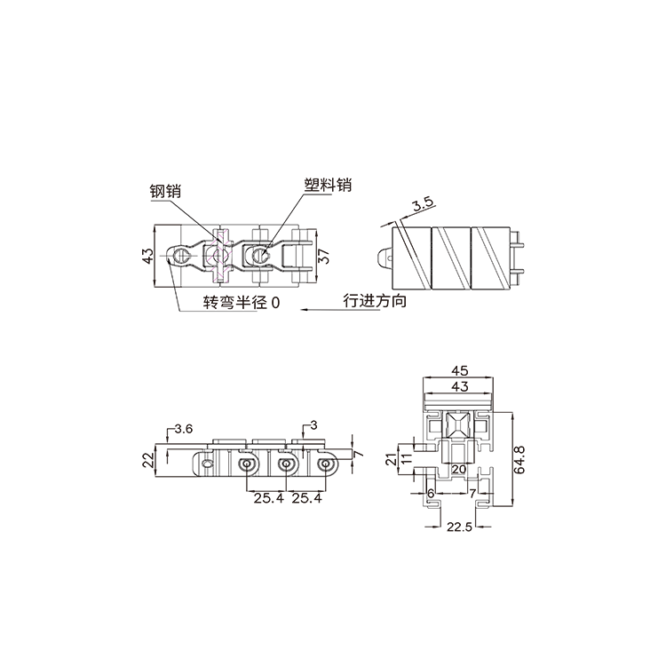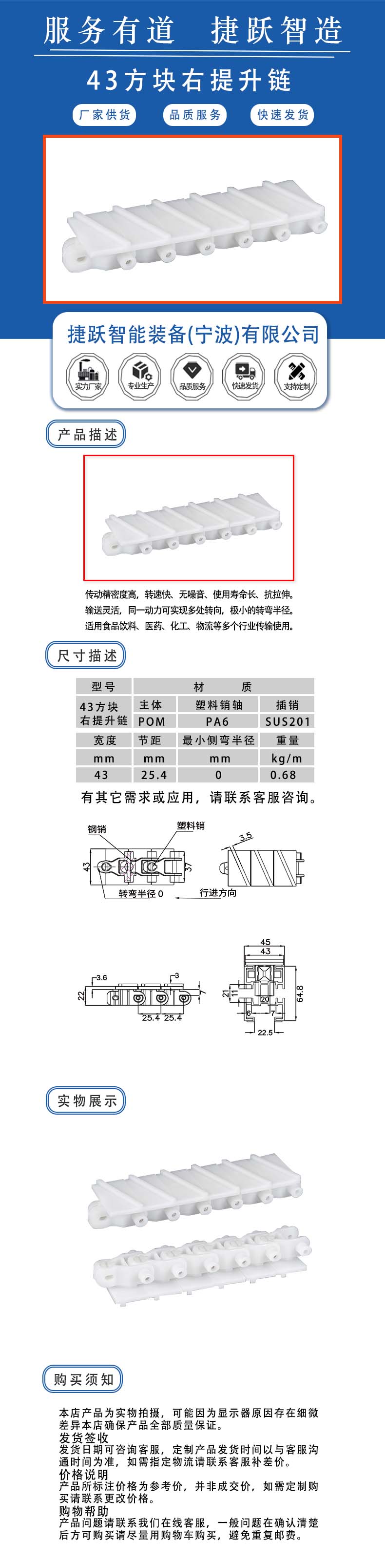 传动精密度高,转速快、无噪音、使用寿命长、抗拉伸。 输送灵活,同一动力可实现多处转向,极小的转弯半径。 适用食品饮料、医药、化工、物流等多个行业传输使用。