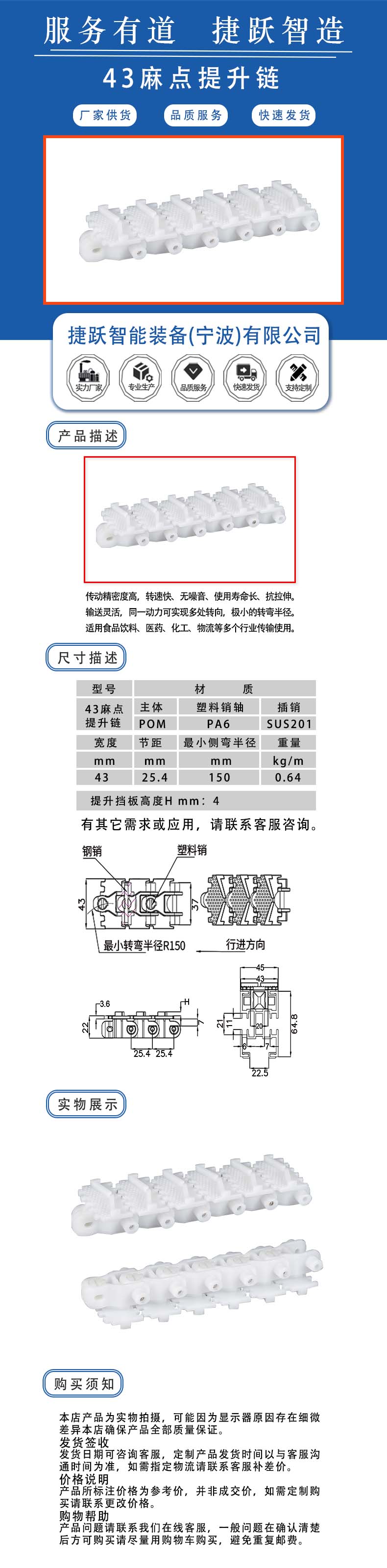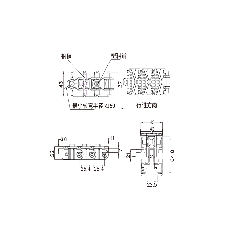 传动精密度高,转速快、无噪音、使用寿命长、抗拉伸。 输送灵活,同一动力可实现多处转向,极小的转弯半径。 适用食品饮料、医药、化工、物流等多个行业传输使用。
