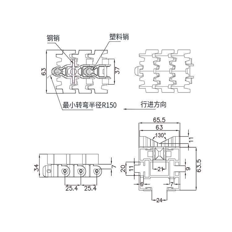 传动精密度高,转速快、无噪音、使用寿命长、抗拉伸。 输送灵活,同一动力可实现多处转向,极小的转弯半径。 适用食品饮料、医药、化工、物流等多个行业传输使用。