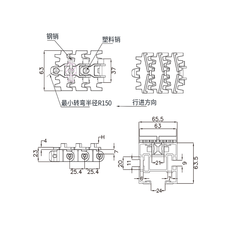传动精密度高,转速快、无噪音、使用寿命长、抗拉伸。 输送灵活,同一动力可实现多处转向,极小的转弯半径。 适用食品饮料、医药、化工、物流等多个行业传输使用。