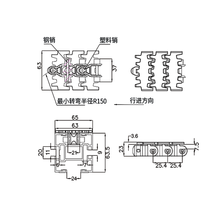 传动精密度高,转速快、无噪音、使用寿命长、抗拉伸。 输送灵活,同一动力可实现多处转向,极小的转弯半径。 适用食品饮料、医药、化工、物流等多个行业传输使用。