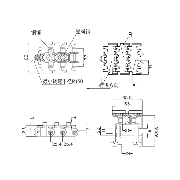 传动精密度高,转速快、无噪音、使用寿命长、抗拉伸。 输送灵活,同一动力可实现多处转向,极小的转弯半径。 适用食品饮料、医药、化工、物流等多个行业传输使用。