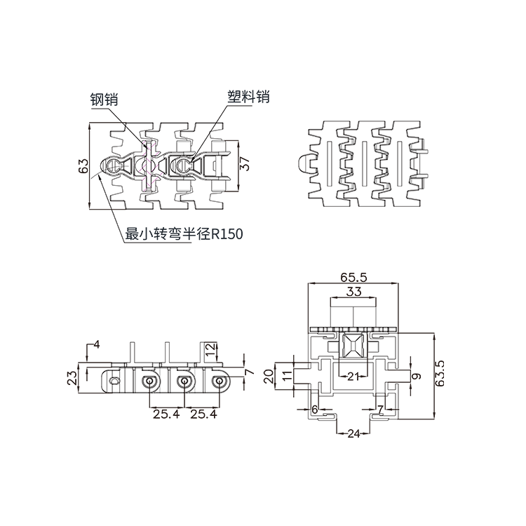 传动精密度高,转速快、无噪音、使用寿命长、抗拉伸。 输送灵活,同一动力可实现多处转向,极小的转弯半径。 适用食品饮料、医药、化工、物流等多个行业传输使用。