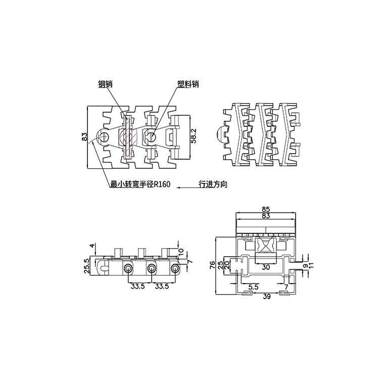传动精密度高,转速快、无噪音、使用寿命长、抗拉伸。 输送灵活,同一动力可实现多处转向,极小的转弯半径。 适用食品饮料、医药、化工、物流等多个行业传输使用。