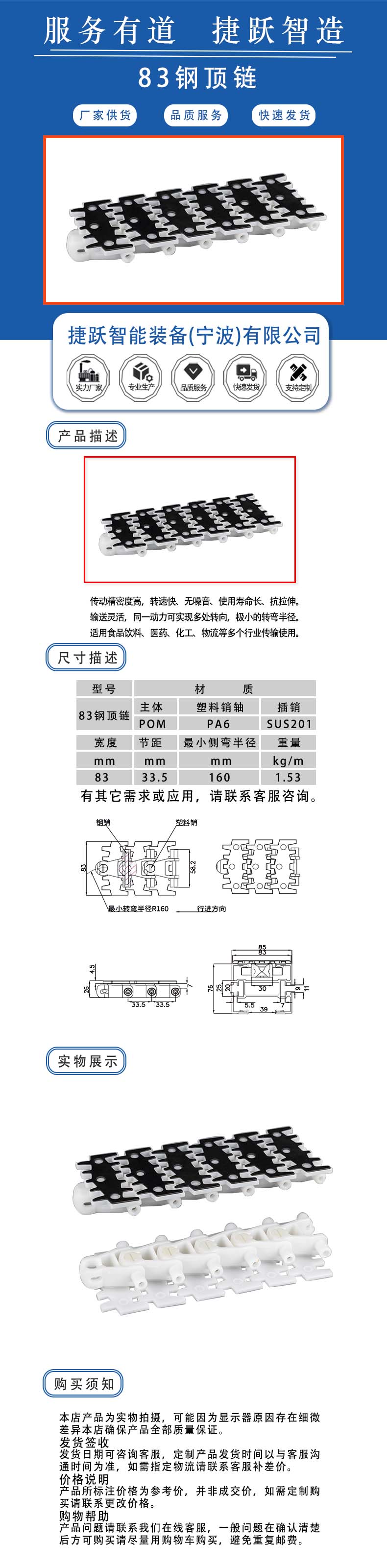 传动精密度高,转速快、无噪音、使用寿命长、抗拉伸。 输送灵活,同一动力可实现多处转向,极小的转弯半径。 适用食品饮料、医药、化工、物流等多个行业传输使用。