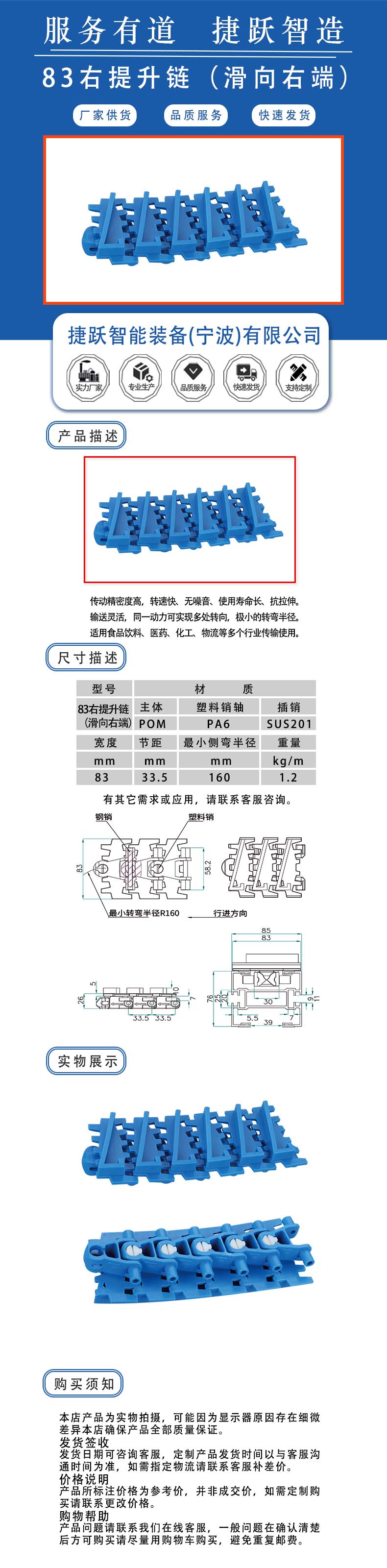 传动精密度高,转速快、无噪音、使用寿命长、抗拉伸。 输送灵活,同一动力可实现多处转向,极小的转弯半径。 适用食品饮料、医药、化工、物流等多个行业传输使用。