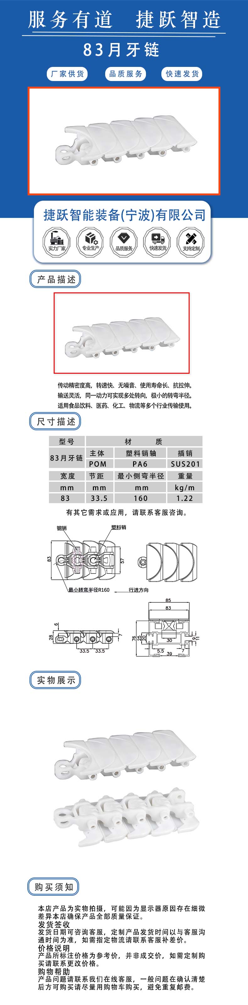 传动精密度高,转速快、无噪音、使用寿命长、抗拉伸。 输送灵活,同一动力可实现多处转向,极小的转弯半径。 适用食品饮料、医药、化工、物流等多个行业传输使用。