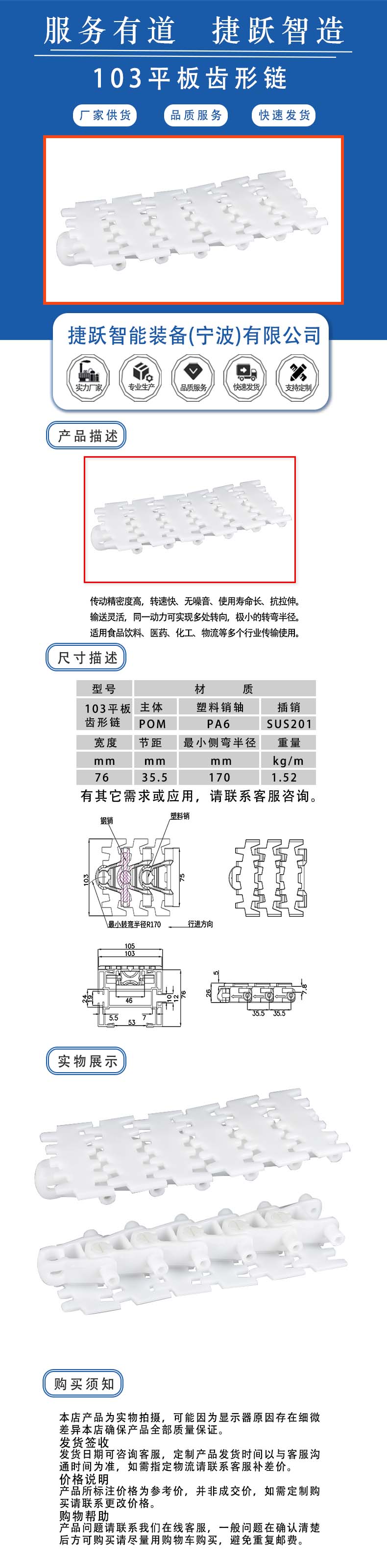 传动精密度高,转速快、无噪音、使用寿命长、抗拉伸。 输送灵活,同一动力可实现多处转向,极小的转弯半径。 适用食品饮料、医药、化工、物流等多个行业传输使用。