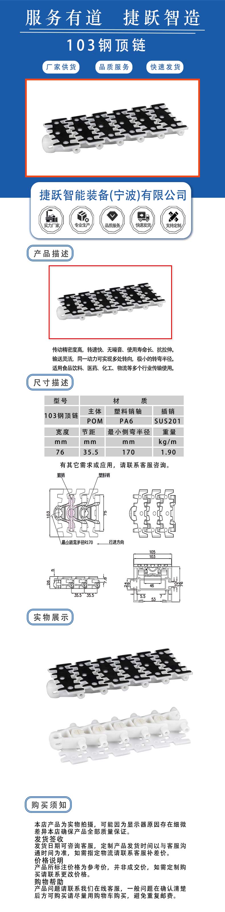 传动精密度高,转速快、无噪音、使用寿命长、抗拉伸。 输送灵活,同一动力可实现多处转向,极小的转弯半径。 适用食品饮料、医药、化工、物流等多个行业传输使用。