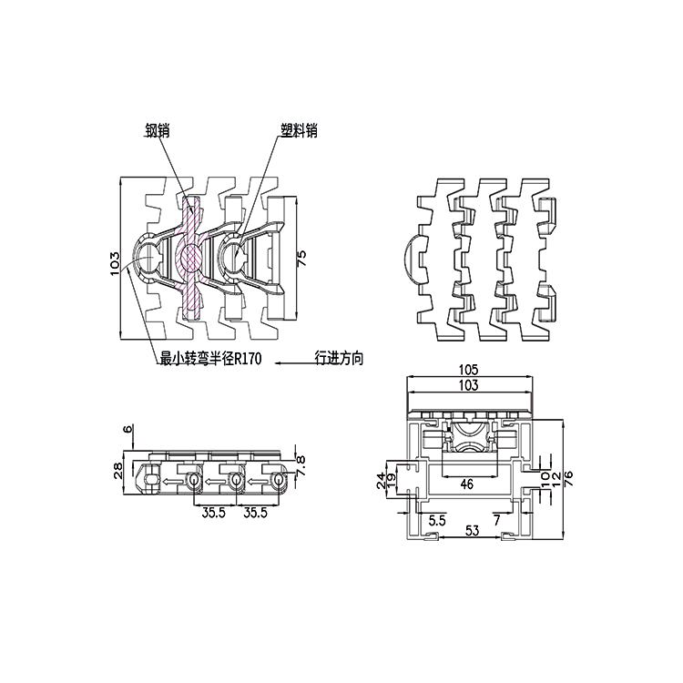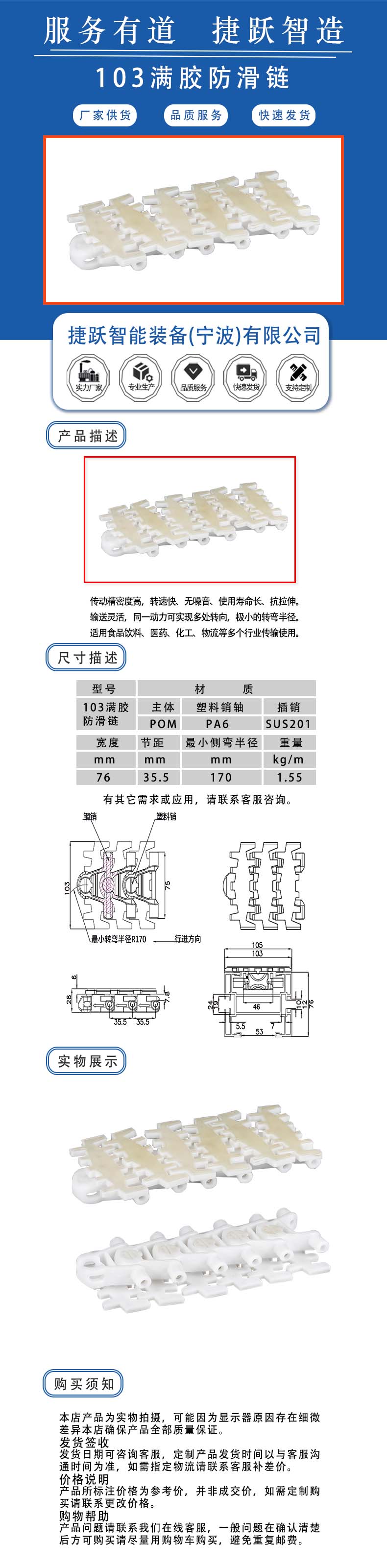 传动精密度高,转速快、无噪音、使用寿命长、抗拉伸。 输送灵活,同一动力可实现多处转向,极小的转弯半径。 适用食品饮料、医药、化工、物流等多个行业传输使用。