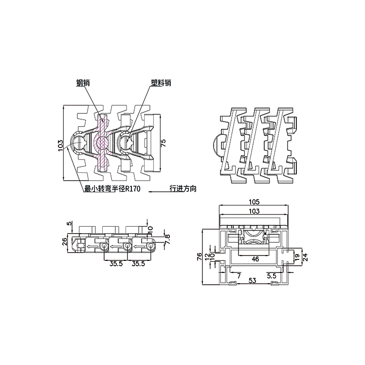 传动精密度高,转速快、无噪音、使用寿命长、抗拉伸。 输送灵活,同一动力可实现多处转向,极小的转弯半径。 适用食品饮料、医药、化工、物流等多个行业传输使用。