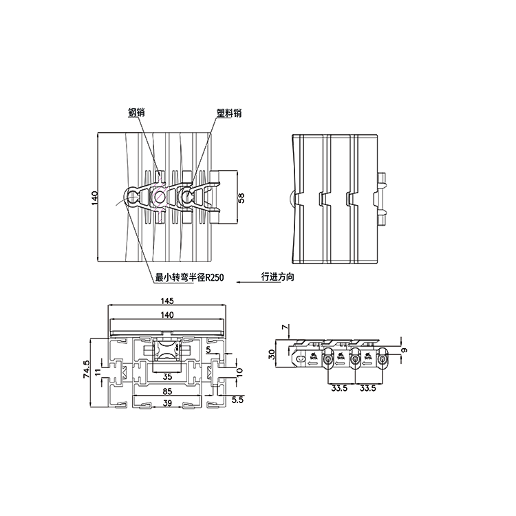 传动精密度高,转速快、无噪音、使用寿命长、抗拉伸。 输送灵活,同一动力可实现多处转向,极小的转弯半径。 适用食品饮料、医药、化工、物流等多个行业传输使用。