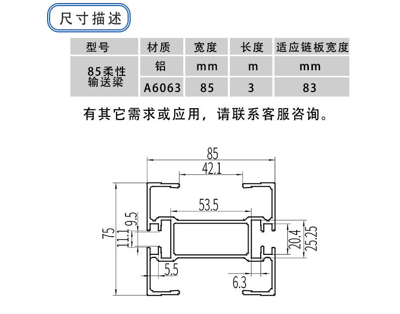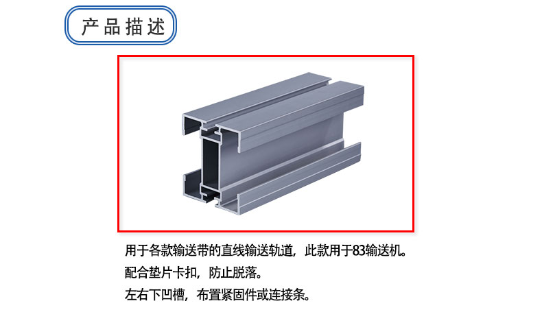 用于各款输送带的直线输送轨道。 配合垫片卡扣,防止脱落。 左右下凹槽,布置紧固件或连接条。