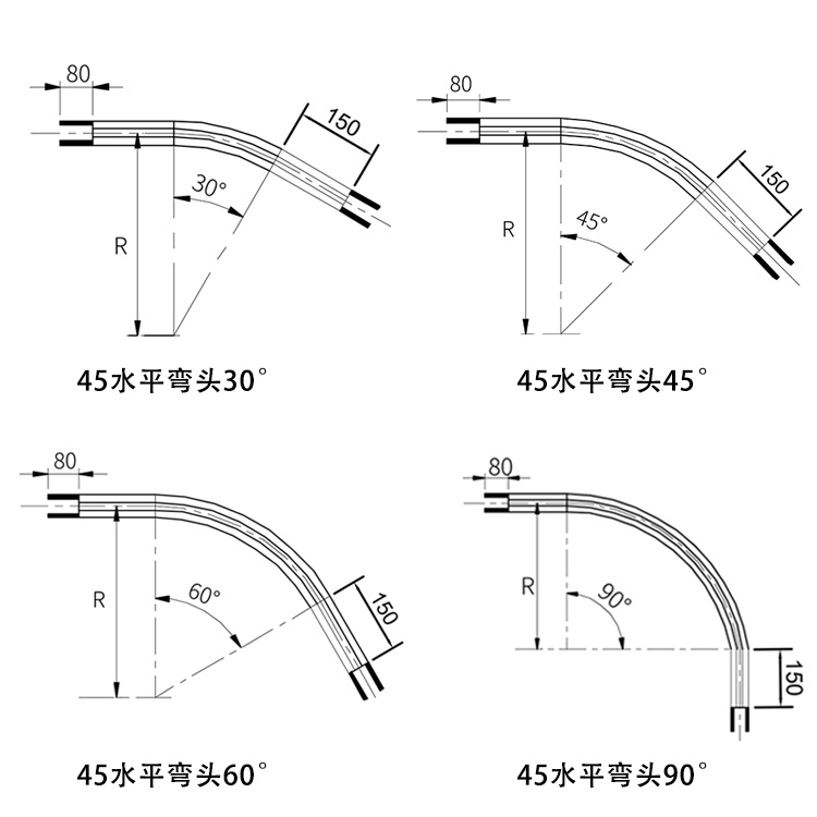 水平普通弯头非标定制需要角度弯度R半径请联系客服确认尺寸。