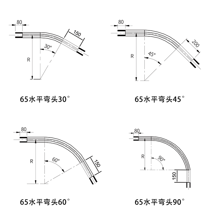 水平普通弯头非标定制需要角度弯度R半径请联系客服确认尺寸。