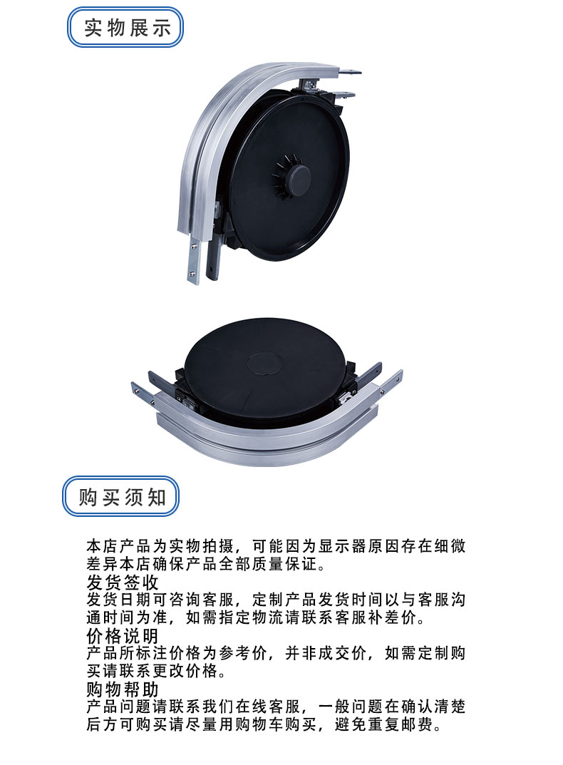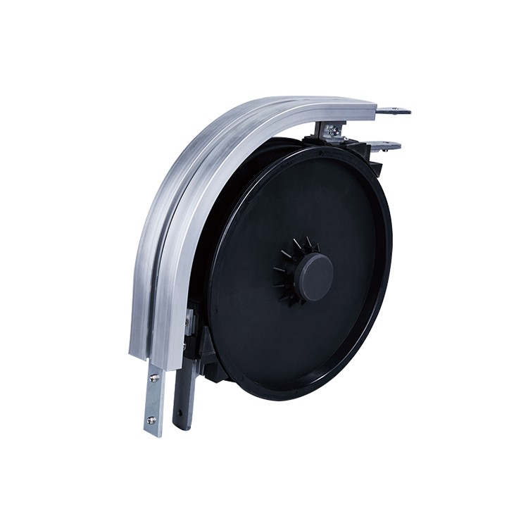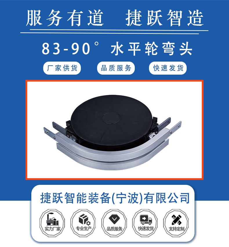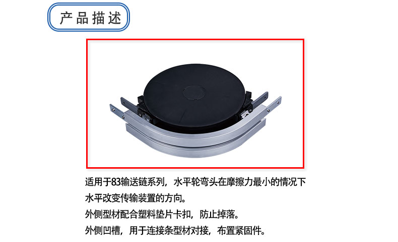 水平轮弯头在摩擦力最小的情况下水平改变传输装置的方向。 外侧型材配合塑料垫片卡扣,防止掉落。 外侧凹槽,用于连接条型材对接,布置紧固件。
